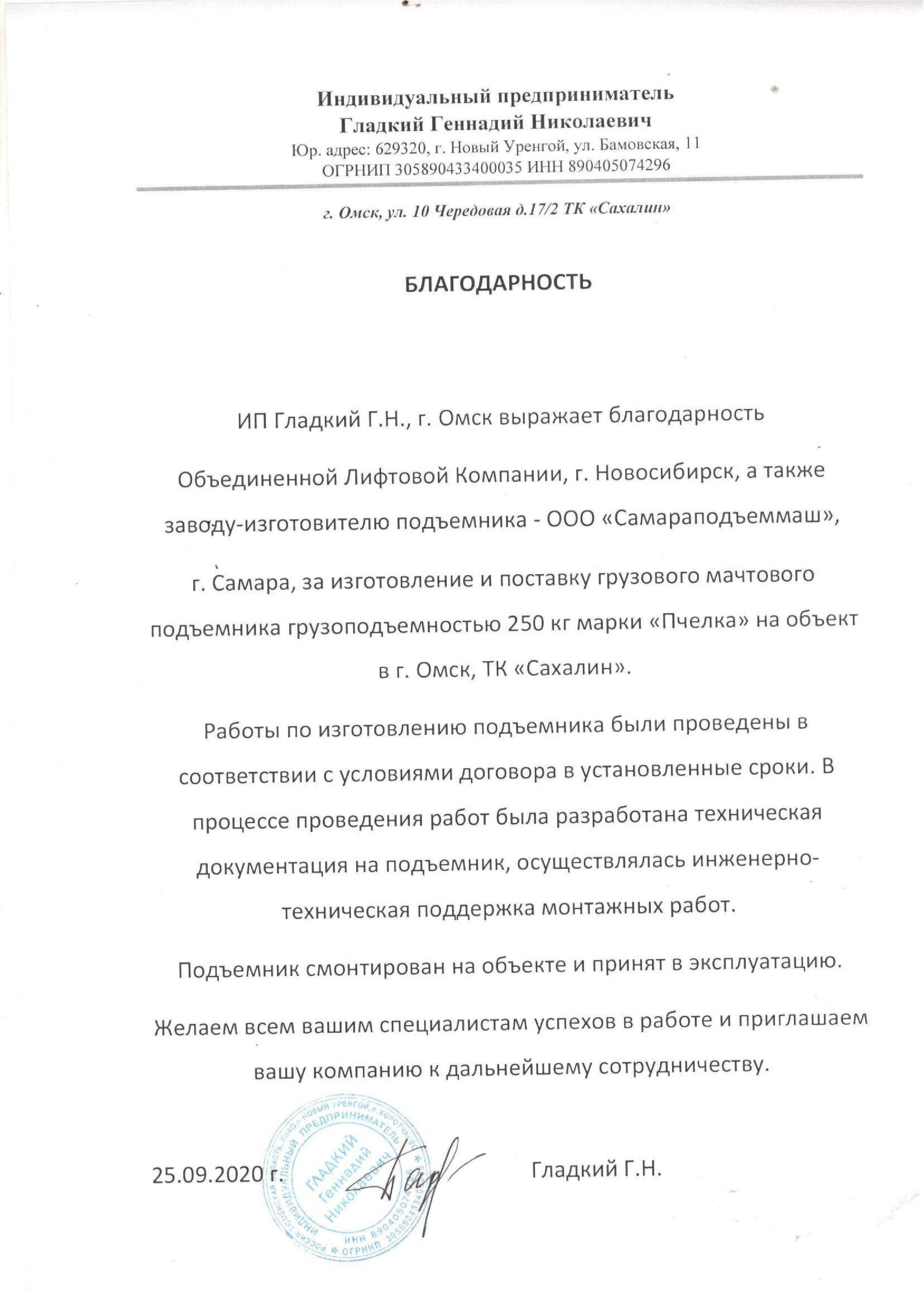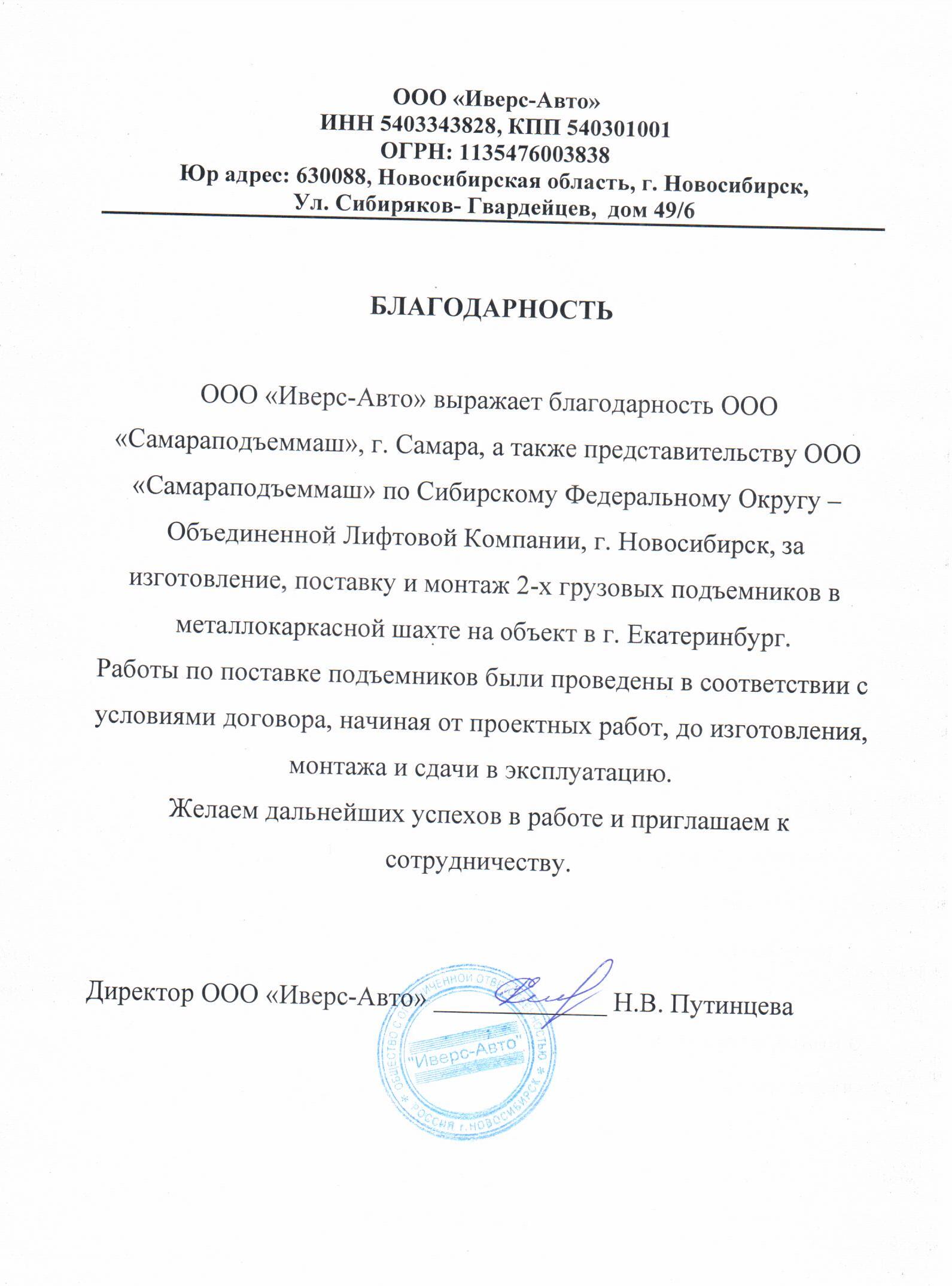Выражаем благодарность всем специалистам ООО «СПМ» за своевременное и качественное выполнение работ по устройству 3-х грузовых подъемников для производственных цехов «Хлебокомбината «Инской», г. Новосибирск.