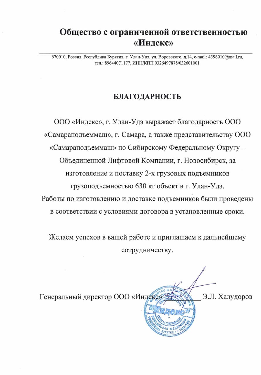 ООО "Индекс", г. Улан-Удэ выражает благодарность ООО "СПМ", г. Самара, а также представительству ООО "СПМ" по Сибирскому Федеральному Округу - Объединенной Лифтовой Компании, г. Новосибирск, за изготовление и поставку 2-х грузовых подъемников грузоподъемностью 630 кг объект в г. Улан-Удэ.