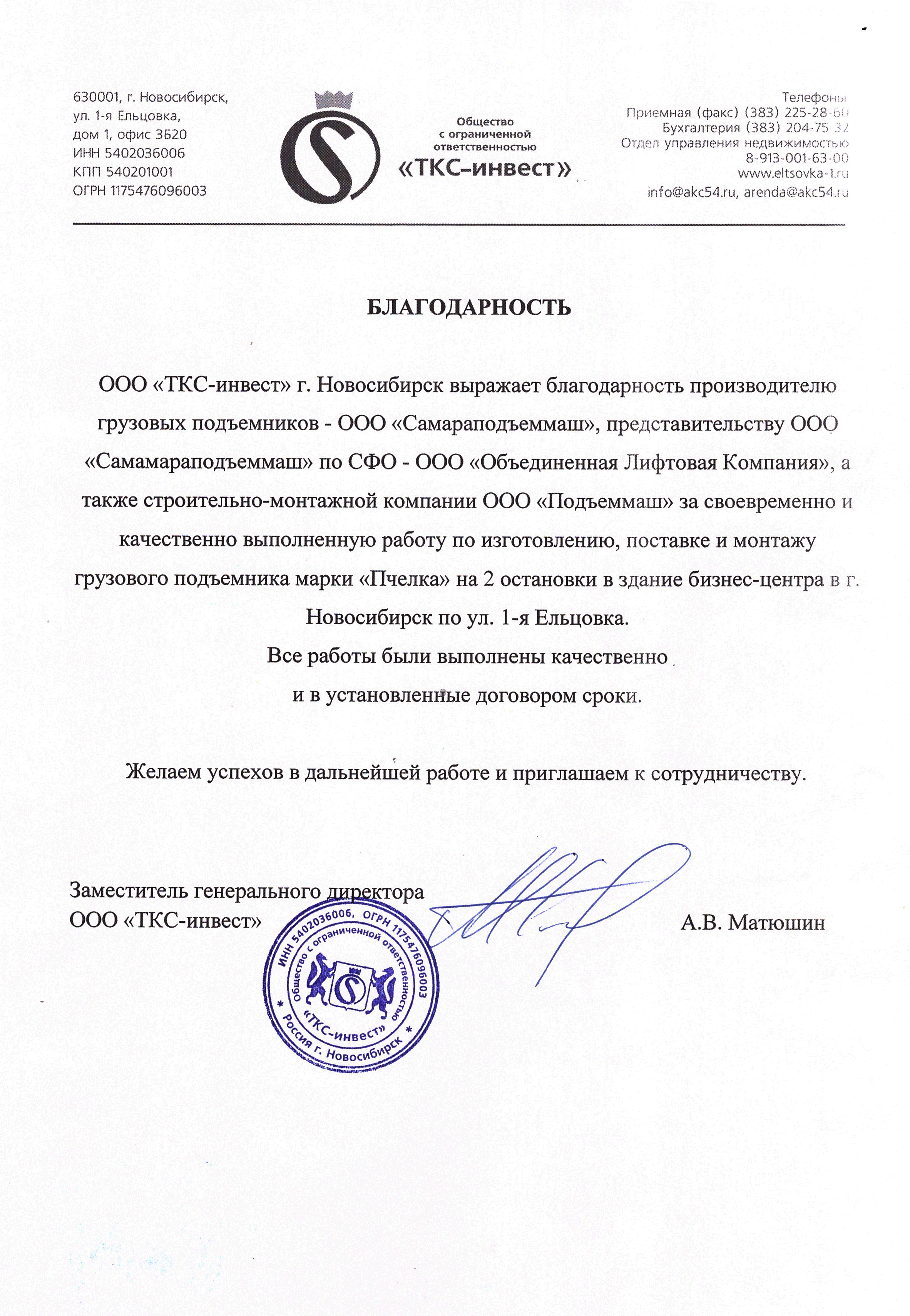 ООО "ЭкспрессЛифтСервис", г. Новосибирск выражает благодарность ООО "СПМ", г. Самара, а также Представительству ООО "СПМ" по Сибирскому Федеральному Округу - Объединенной Лифтовой Компании за изготовление и поставку грузового консольного подъемника с цепным приводом, грузоподъемностью 500 кг на 2 остановки на объект в г. Новосибирск, по адресу ул. Зеленая Горка.